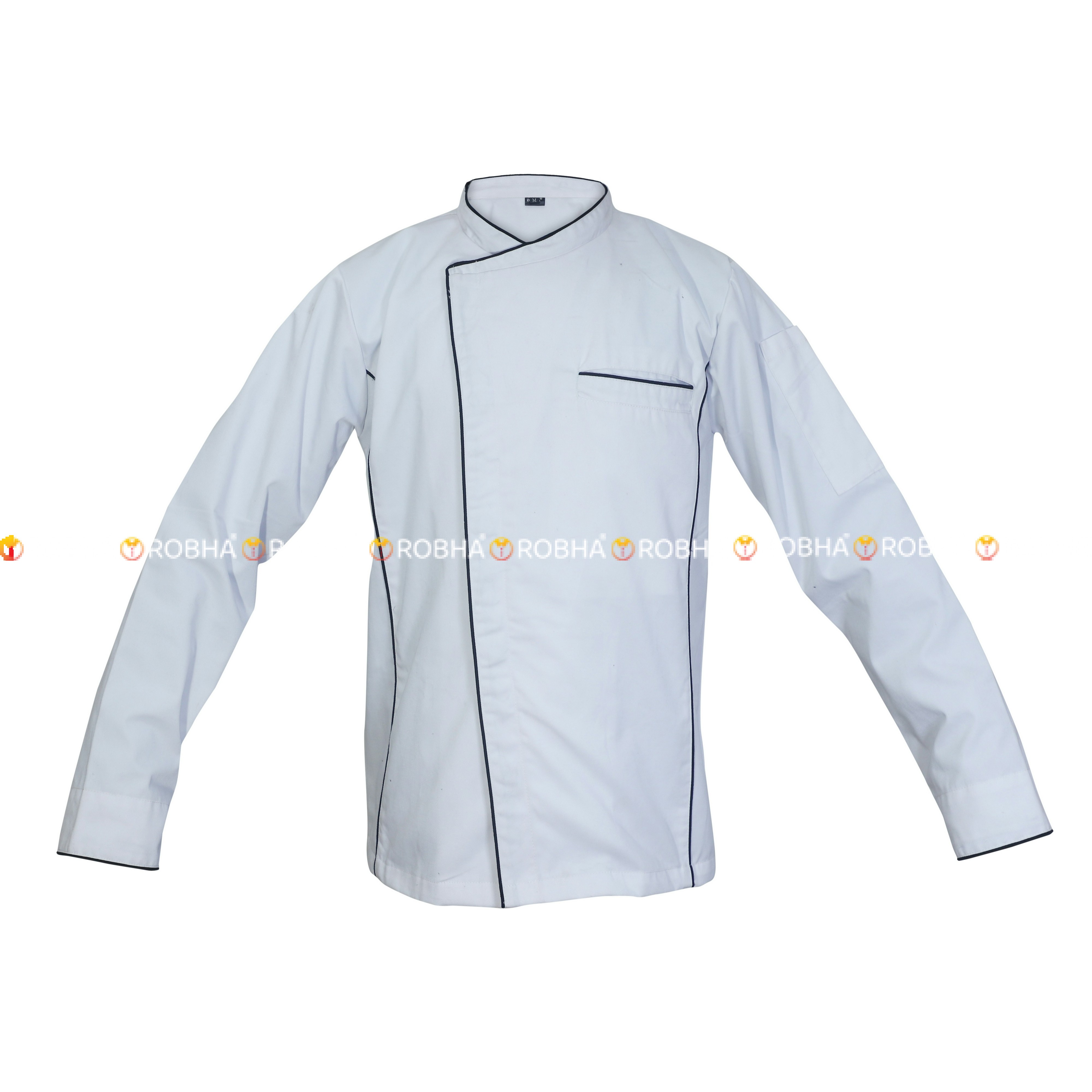 Typically, a chef coat is made of a lightweight, breathable material like cotton or a cotton-polyester blend, which helps to keep the chef cool and comfortable in a hot and often hectic kitchen environment. It typically has long sleeves to provide protection from hot liquids and steam, and a double-breasted front with buttons or snaps to allow the chef to easily adjust the coat for comfort and mobility.