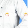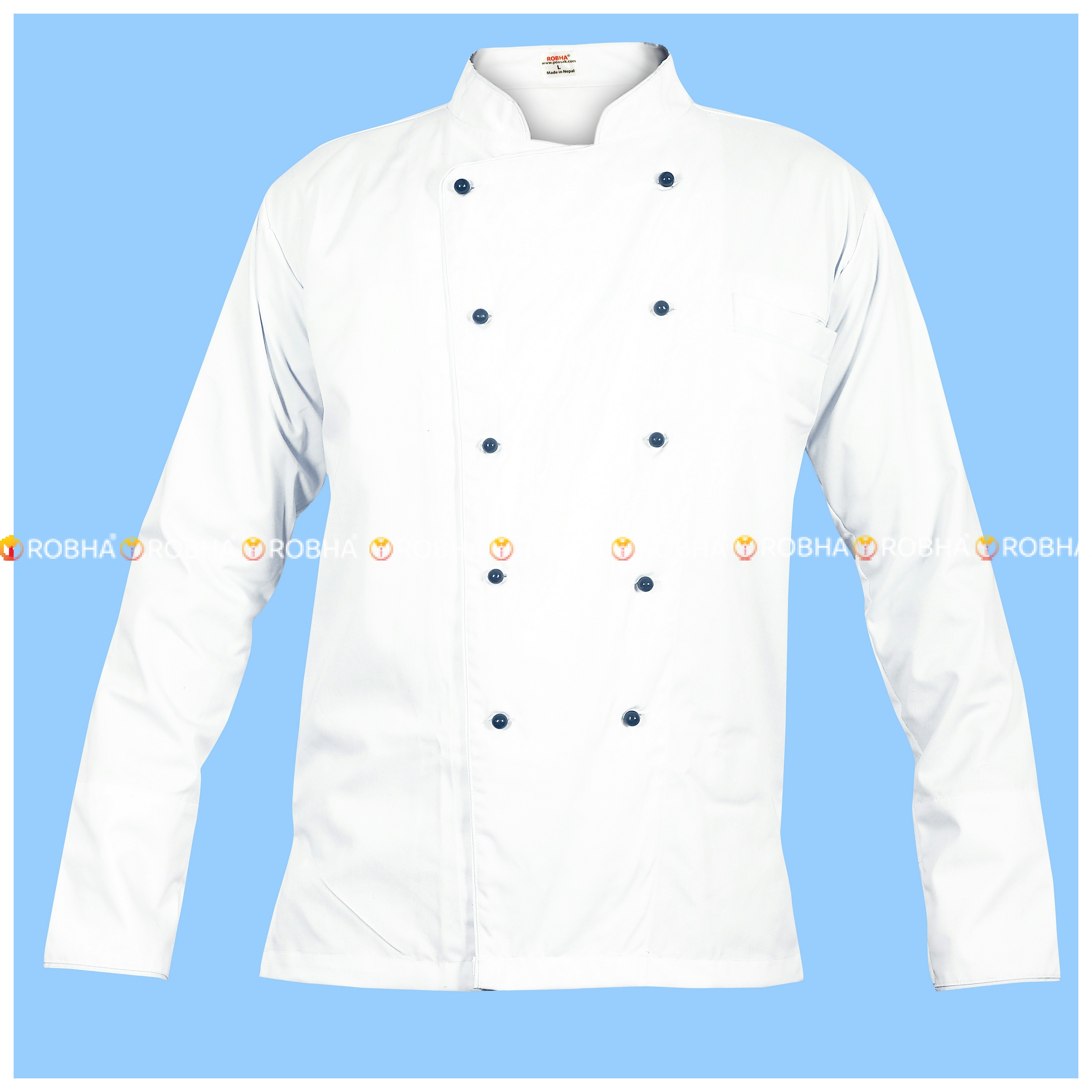 Typically, a chef coat is made of a lightweight, breathable material like cotton or a cotton-polyester blend, which helps to keep the chef cool and comfortable in a hot and often hectic kitchen environment. It typically has long sleeves to provide protection from hot liquids and steam, and a double-breasted front with buttons or snaps to allow the chef to easily adjust the coat for comfort and mobility.